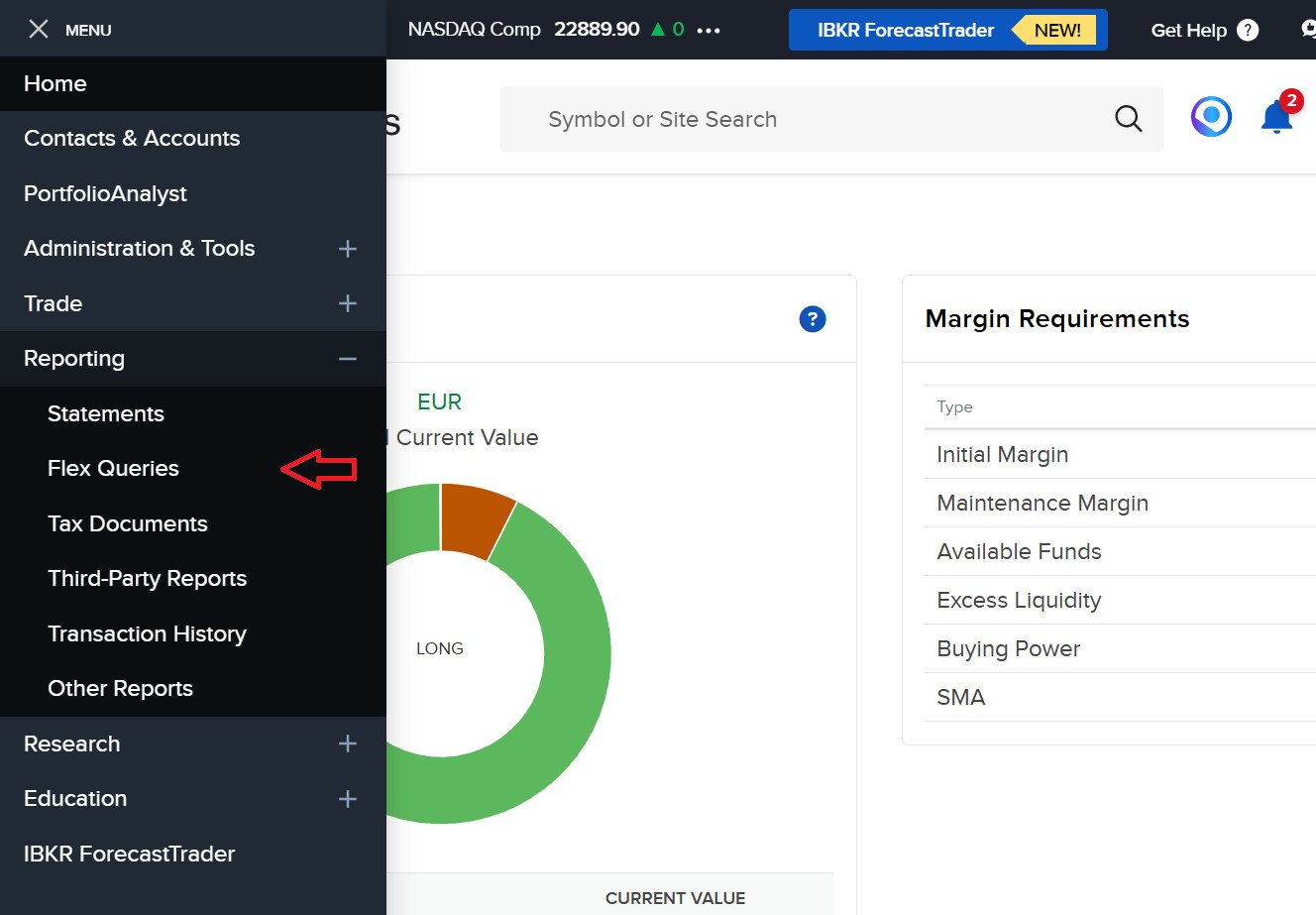 Log in to your Interactive Brokers account through the web portal and navigate to the Flex-Queries page. You can find this menu item on the left side.