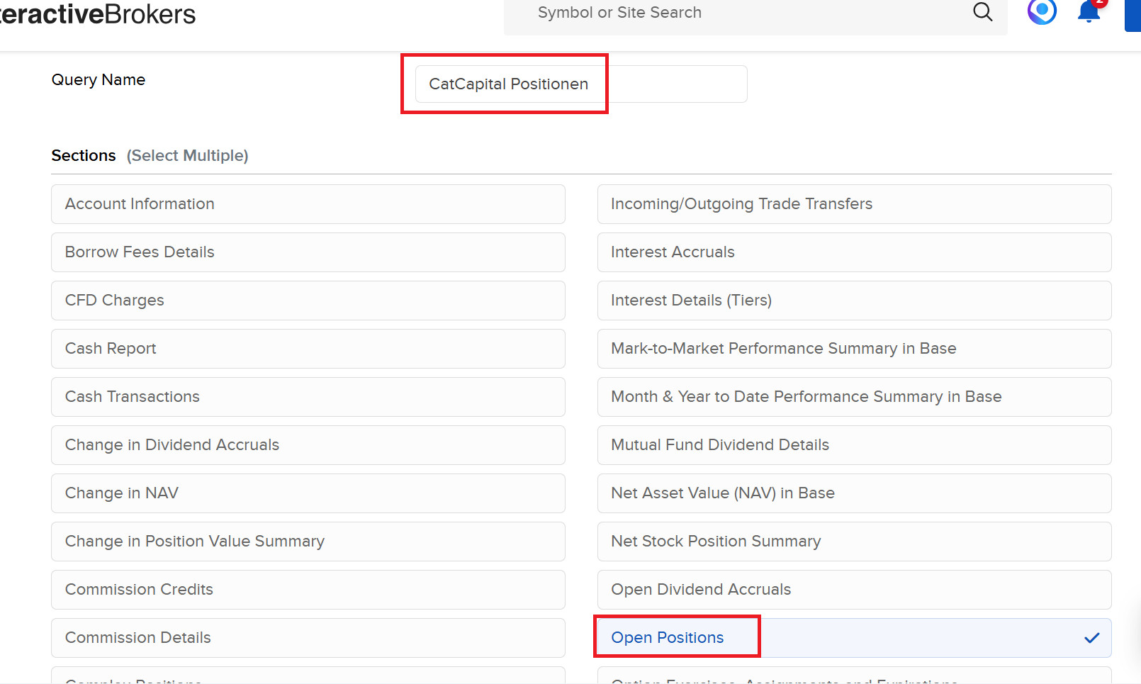 Choose Open Positions for your first Flex-Query and give it a name that's easy to recognize, such as "CatCapital Portfolio".