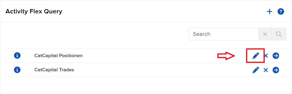After you’ve set up both Flex-Queries, click the "Edit" (pencil) icon. This opens your personal Flex-Query details, including the Query-ID. To automatically update your portfolio and trades, we need both your Flex-Token and the respective Flex-Query-ID.